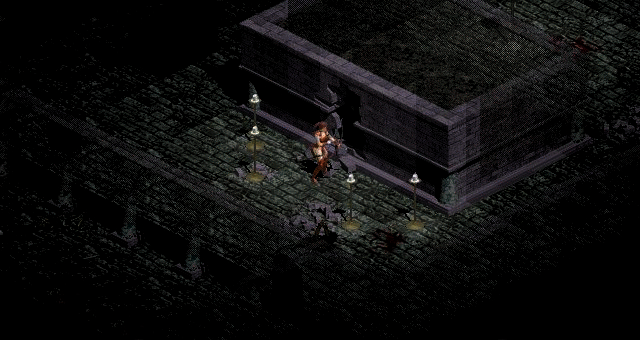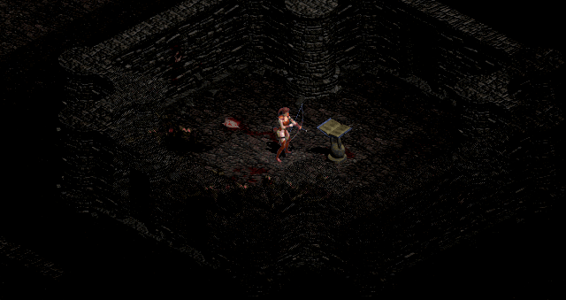 Allez ensuite dans la pièce suivante (il y a une porte en face), ramassez la Blood Stone, puis interagissez avec le Pedestal of Blood : le bloc de gauche doit s'être transformé en pièce, avec deux autres Horned Demons, et une autre Blood Stone. Ramassez-la, interagissez avec le Pedestal of Blood... faites pareil avec le bloc de droite.